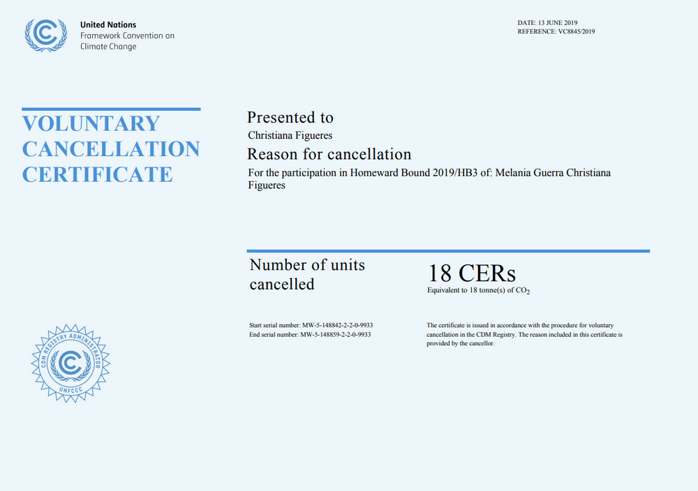 An example of the United Nations certificate is shown below. It shows your name, the amount of carbon offsets you have purchased, and serial numbers of the offsets that have been cancelled for you. When the UN cancels your offsets, they also create a public record of this cancellation on their website. You can use the certificate in combination with this public entry as proof that you have offset your emissions. This proof is often required under official carbon neutral schemes in case you want to go down this path.